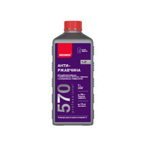 Предназначен для удаления ржавчины с металлических, бетонных, эмалированных и каменных поверхностей. Останавливает и предотвращает коррозионное разрушение. Может использоваться для подготовки поверхности металлов перед нанесением порошковых или жидких лакокрасочных покрытий. После применения препарата на поверхности металла образуется плотная защитная пленка из нерастворимых в воде комплексных соединений, обеспечивающая высокую защиту от коррозии на срок до 12 лет, при условии последующего покрытия основания соответствующим лакокрасочным составом. Средство повышает адгезию краски к оцинкованным и другим металлическим поверхностям. Применение: NEOMID 570 – концентрат. Перед применением концентрат развести водой в соотношении 1:2.